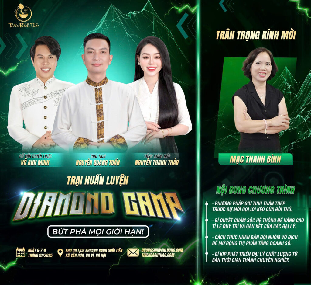 Diamond Camp 2025 là chương trình huấn luyện đặc biệt do Thiên Bách Thảo tổ chức, diễn ra từ 06 – 08/10/2025 tại Khoang Xanh – Suối Tiên, Ba Vì.