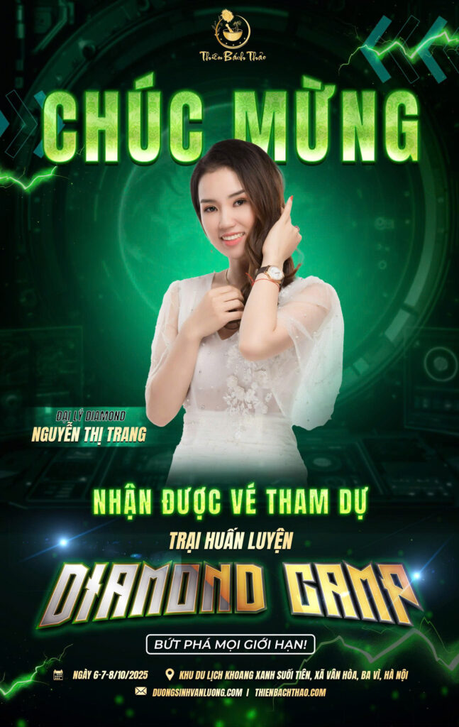 Trong hành trình phát triển mạnh mẽ của Thiên Bách Thảo và mô hình CLB Chăm sóc Sức khỏe Chủ động Công nghệ 2TeB, một dấu ấn đặc biệt vừa được ghi nhận. Xin chúc mừng Nguyễn Thị Trang – Đại lý Diamond xuất sắc, đã chính thức giành tấm vé danh giá tham dự Diamond Camp 2025 – trại huấn luyện đỉnh cao kéo dài 3 ngày 2 đêm.